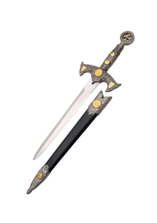 Daga Templaría, con acabados en níquel en el pomo, la empuñadura y la guarda. Con un tamaño total 49.5 cm, hoja de acero, la vaina es en negro con detalles en níquel.