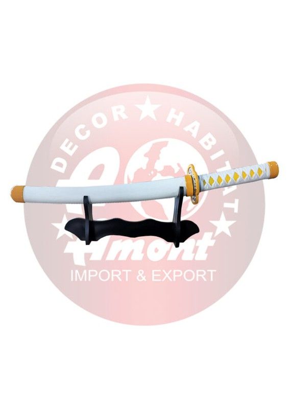 Katana de Demon Slayer empuñada por Agatsuma Zenitsu réplica no oficial de 40 cm hoja de acero, mango con encordado blanco e imitación de piel de raya en color naranja.